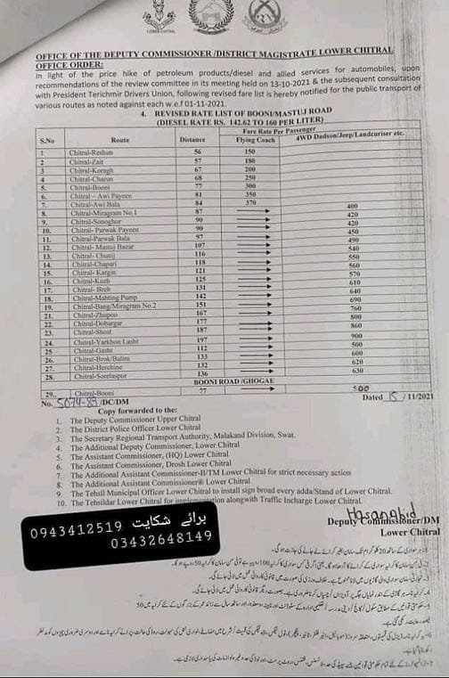 CHITRAL: The district administration Lower Chitral has revised the fares of public transport from Chitral town to different areas of Upper Chitral.
