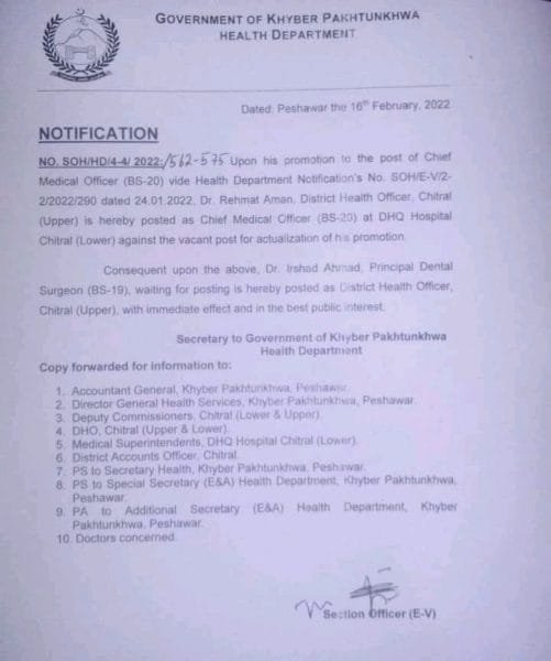 CHITRAL: Dr Irshad Ahmed, principal dental surgeon (BPS-19), has been appointed as the district health officer (DHO) of Upper Chitral.
