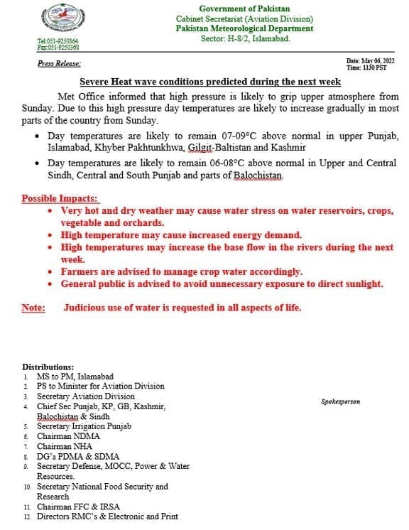 ISLAMABAD: The Pakistan Meteorological Department on Friday forecast \”severe heatwave conditions\” across Pakistan during the next week, stating that high pressure was likely to grip the upper atmosphere from Sunday (May 8).