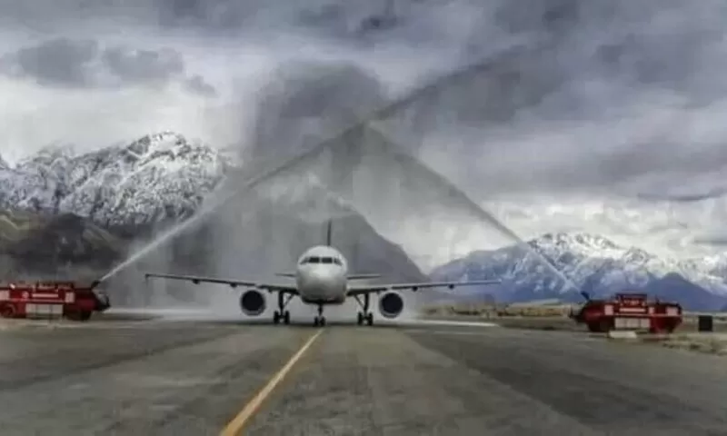 The flight received a water cannon welcome upon landing at the airport while passengers were presented with bouquets of flowers.Gilgit-Baltistan Chief Secretary Mohyuddin Ahmed Wani termed the development “a historic moment”.
