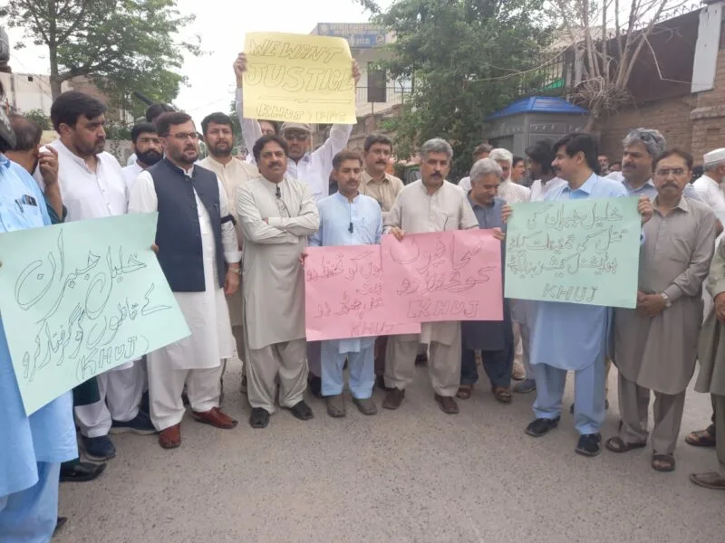 A large number of journalists, including office-bearers participated in the protest. They held banners and placards bearing slogans such as \”Protect Journalists\”, \”Arrest Killers of Khalil Jibran\”, and \”Journalism is Not a Crime\”.