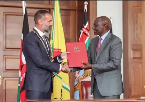 Prince Rahim Aga Khan exchanges fo documents with Kenyan president during his first official visit to Kenya as 50th Imam of Ismailis in Aug 2025.