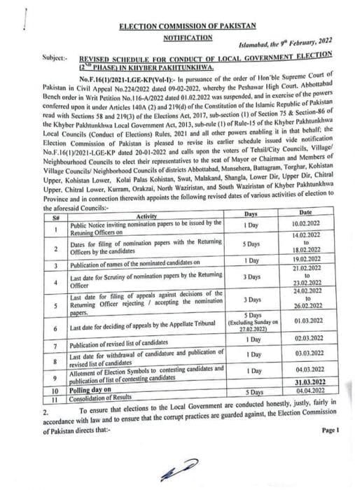 CHITRAL: After the Supreme Court suspended the Peshawar High Court order of delaying the local government elections in 18 districts of KP from March 27 to after Ramazan (in April), the Election Commission of Pakistan on Wednesday rescheduled the polls to March 31. In a notification, the ECP said nomination papers from candidates would be […]